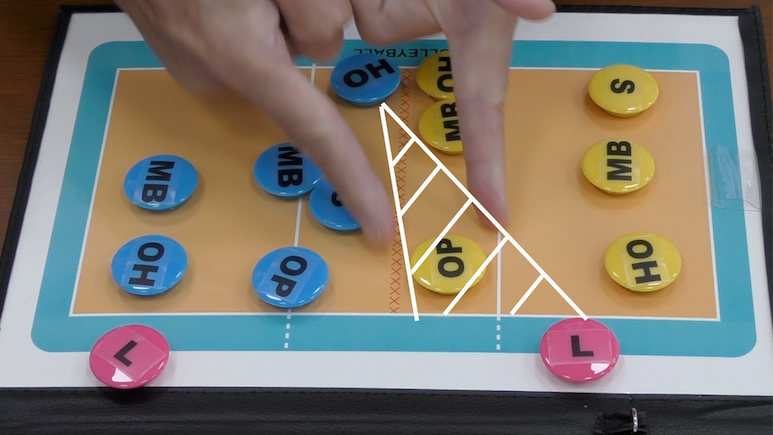 でこいつ(=アウトサイドヒッター:OH)はやっぱり(ブロックが)3枚来ると、(アタックを)かち上げてワンタッチ(で得点を)狙うか、ここの超インナー(コースを)狙っていくか。でも難しいからこう対角(へのアタック)だったら(ブロックの)上からいけるよねって(考える)。であとフェイント。ここに(守備が)位置してないんだったら、フェイントをここに持っていってもいいじゃないかって、フェイントをって(考える)。