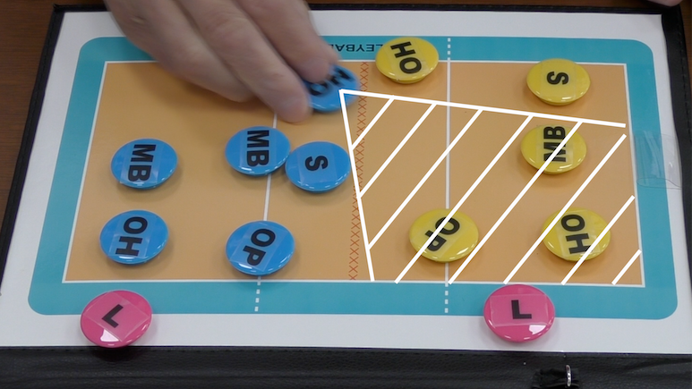 この(ポジションが)扇形になると(相手に攻撃を)ここに打たれた時に、こいつ(=選手)が(ディグに)行ったり。こいつ(選手)が行ったり。こいつ(選手)が行ったり(して混乱)するんですよ。