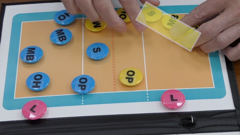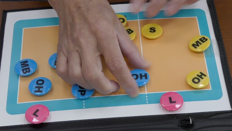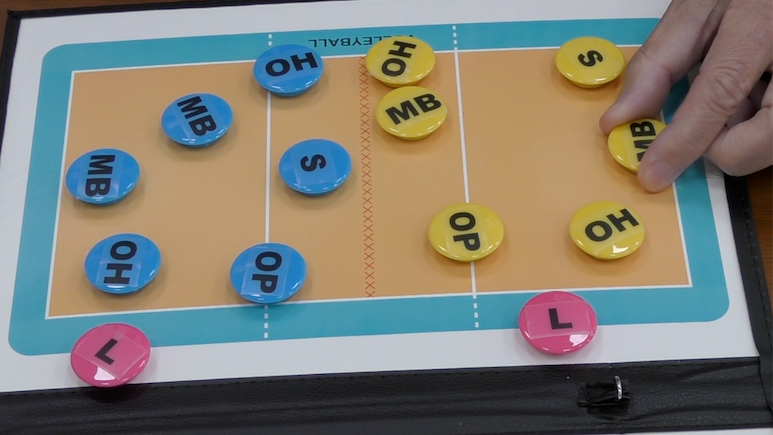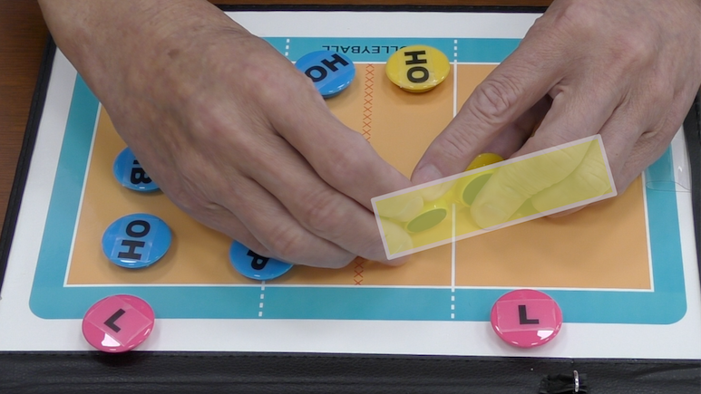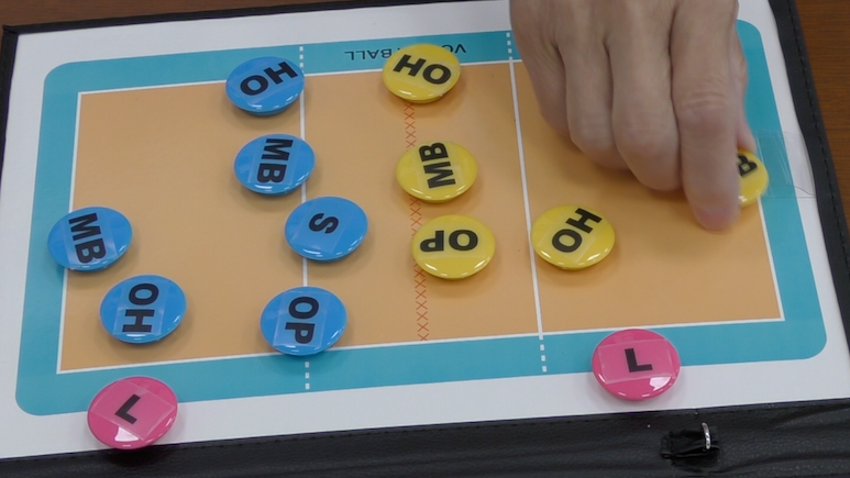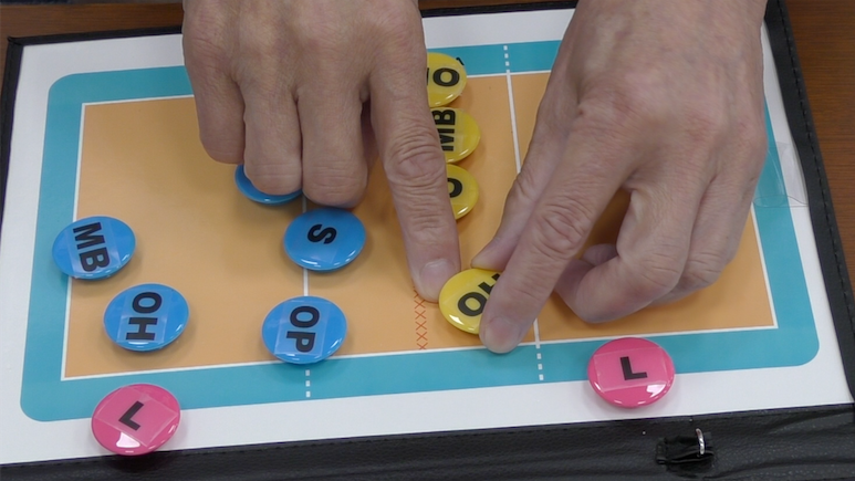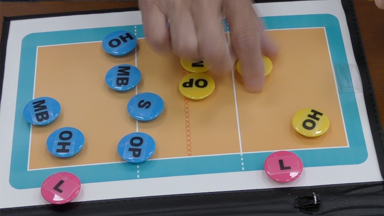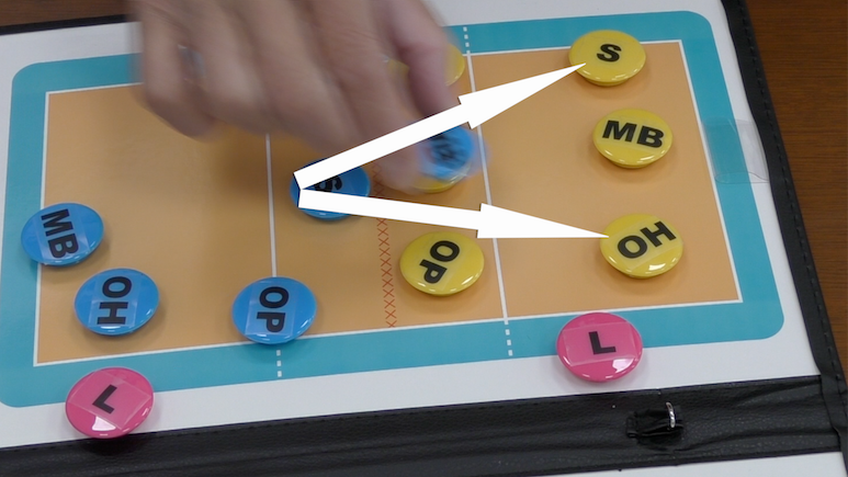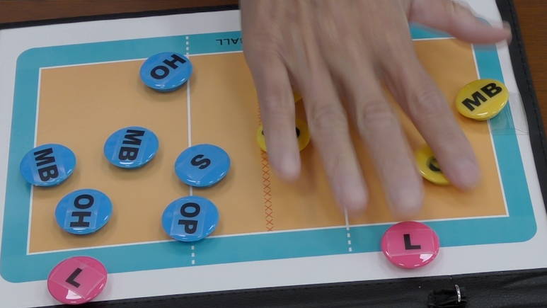でここを押さえるのか。それとも対角を押さえて。こいつ(=ミドルブロッカー:MB)をワンタッチ(ボールを)押さえて、こいつ(=セッター:S)はフェイント(のカバー)に入るのかとか。それ(は)チームでもう約束事を決めればいいんですよ。